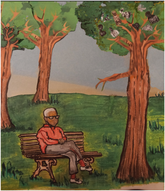 The author sits in Rock Creek Park reflecting on trees. illustration by his granddaughter.