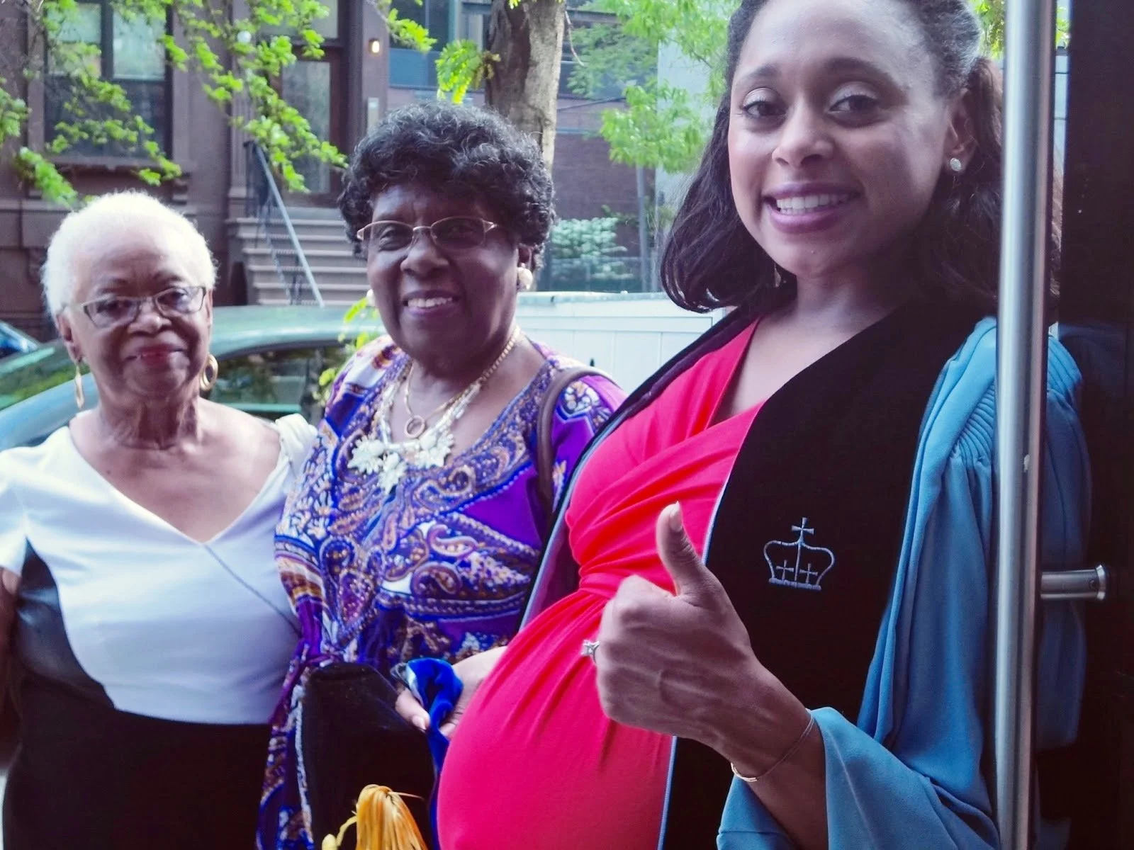 Four generations: Loretta Wynn and Surlene Grant, Rae Wynn Grant's grandmothers, and Rae with Zuri in utero before 2015 Columbia University commencement where she received her doctorate. Toni Wynn was on the scene taking the shot. (Photo: Wynn-Grant collection)