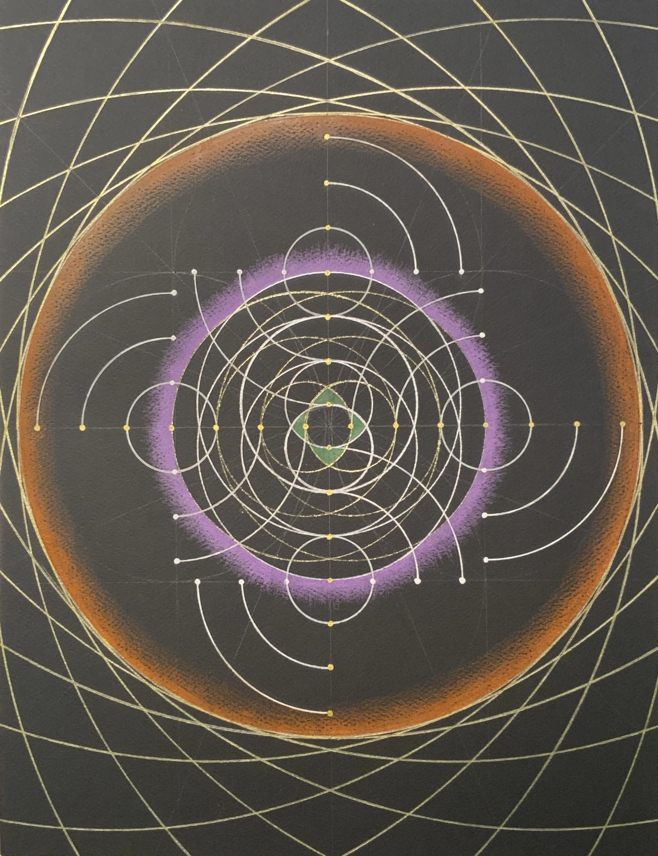 Vandorn Hinnant, A Template for re-Awakening the Human Soul a.k.a, An Alternate Geometric Mapping of Set Theory, January 10, 2026, graphite, ink, metallic inks, prismacolor pencils, luminous thinking on black paper dimensions: 11.5" x 9"