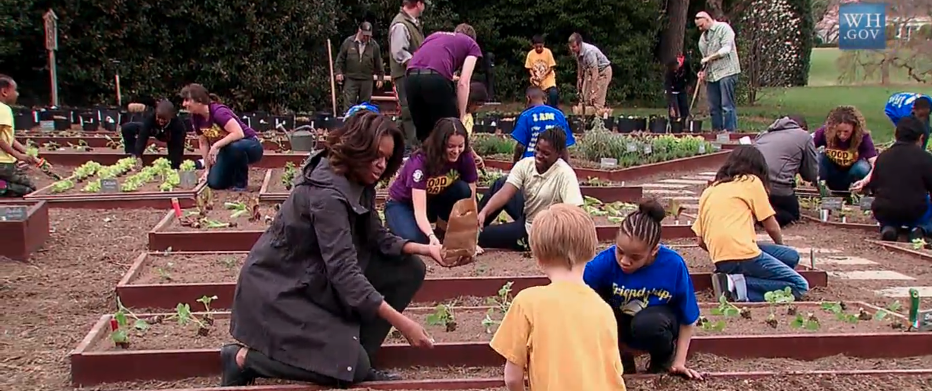 Michelle Obama and DC school children planting the sixth White House Garden in spring 2015.