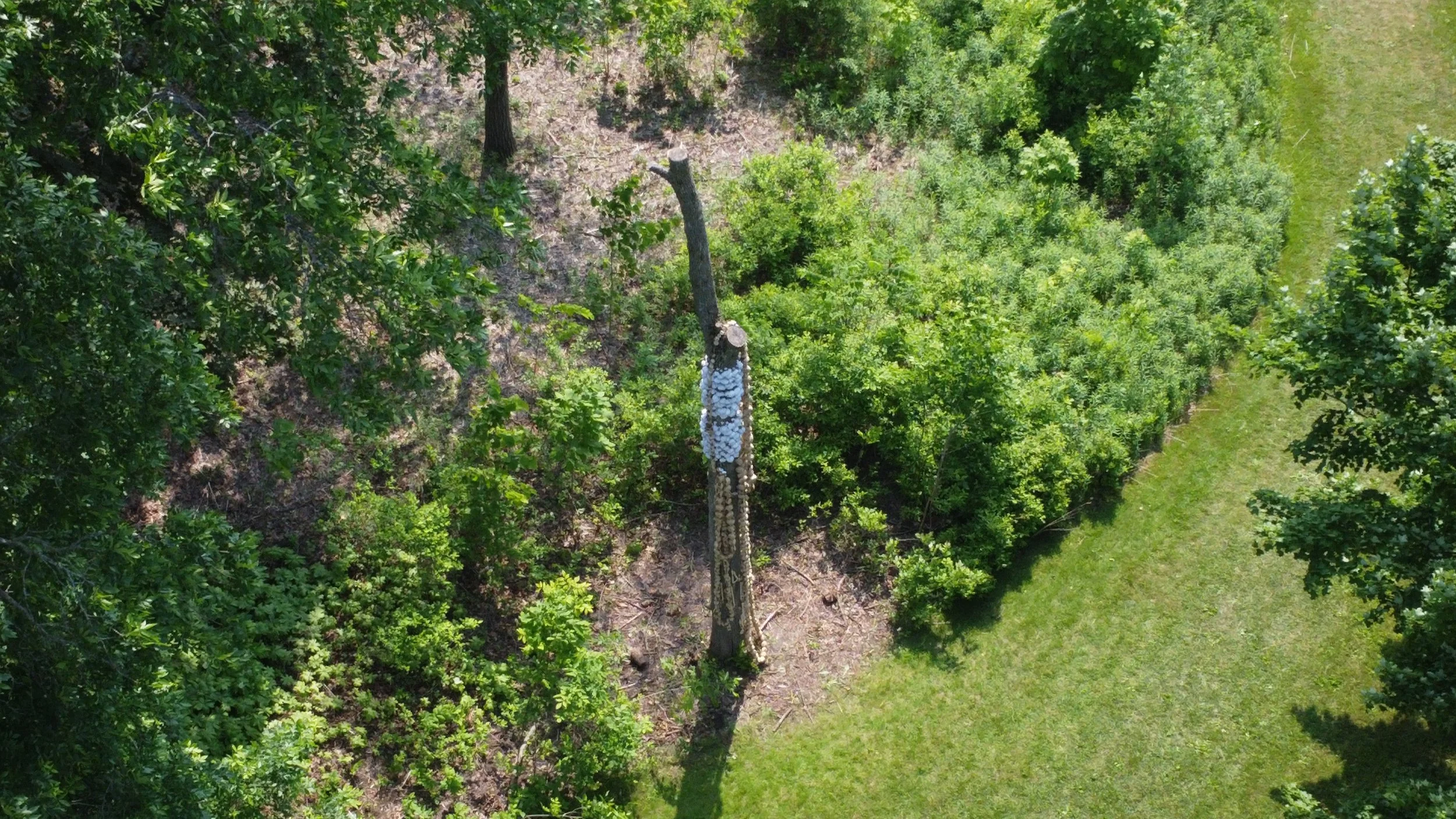 “I was reminded of the people I knew at home carving wood canes and that kind of thing.” The communal carving memory was his impetus for carving large beads from the limbs of the dead tree to “adorn it with the beads that come out of itself.”